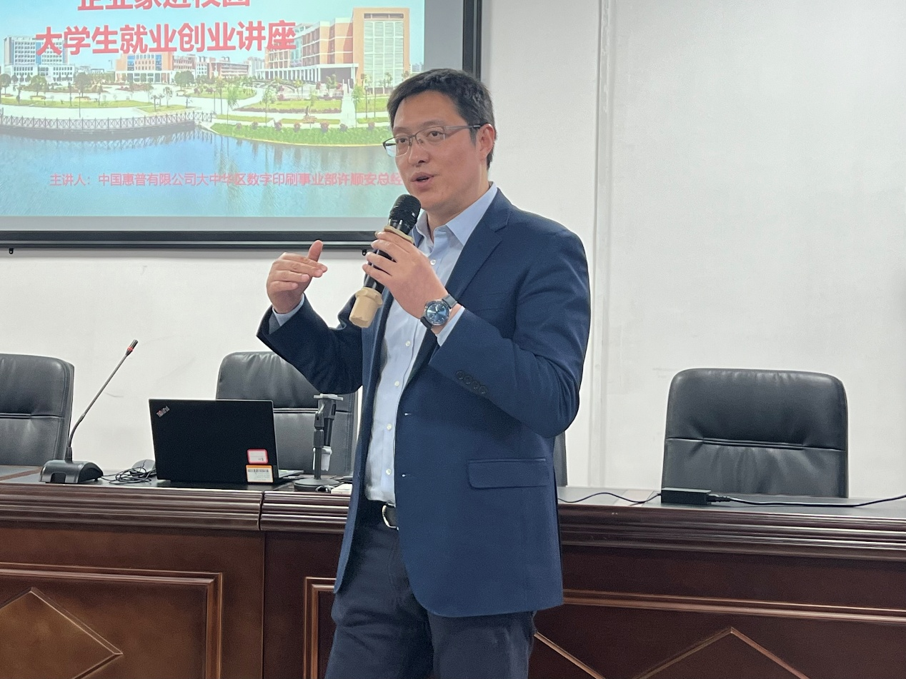 本网讯(通讯员 李钰 刘敏佳)工欲善其事,必先利其器。为了帮助大学生开拓视野,了解就业市场和创业环境的真实情况,管理学院于2024年11月26日下午16时整在管理楼504会议室举办“企业家进校园,大学生就业创业”讲座。本次讲座邀请了中国惠普有限公司大中华区数字印刷事业部总经理许顺安作为主讲嘉宾,管理学院院长汤勇主持,管理学院团委书记李钰及部分学生与会。
