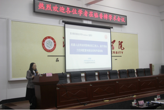 第一位汇报人是来自广东金融学院的付明辉老师,她汇报的主题是《机器人应用如何影响农民工收入:基于劳动力空间配置和就业结构升级视角》。报告通过引入数字化技术影响收入分配的理论模型,分析机器人应用对劳动力收入的影响及作用机制,并运用2015-2018年中国流动人口动态监测数据和国际机器人联合会(IFR)工业机器人数据进行实证检验。结果表明:机器人应用显著提升了农民工的工资收入,机器人密度每增加10%,农民工的工资收入将显著提高0.48%,即农民工的工资收入提高16.75元。在运用Heckman样本选择模型和遗漏变量偏误检验法检验内生性问题后,结论依然成立。机制检验表明,机器人应用将通过农民工的劳动力空间配置、就业技能结构升级和行业结构升级三种渠道影响农民工收入。城市异质性分析表明,机器人应用显著提高了城市群、省会城市、直辖市以及低房价城市农民工的工资。进一步分析发现,机器人应用的收入分配效应对中低收入农民工更有利,具有共同富裕效应,并且显著促进了农民工收入向上流动。