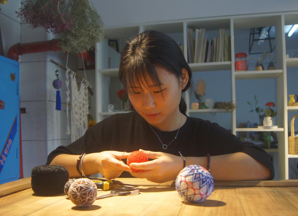 编织带、刺绣、手工纸花、手鞠球、彩砂瓶……工作室里品类众多的手工制品,每一样都浇注了她发自内心的热爱。